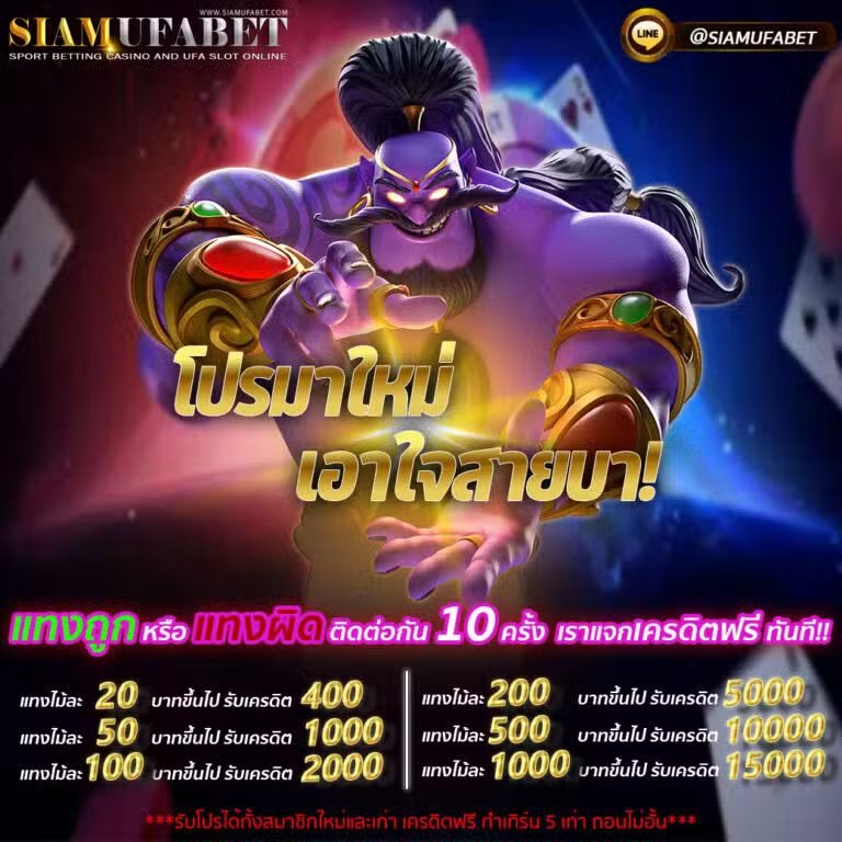 ถ้าคุณกำลังมองหาเว็บพนันออนไลน์ที่มีโปรโมชั่นสุดคุ้ม siamufabet เป็นอีกหนึ่งตัวเลือกที่น่าสนใจ ด้วยโปรโมชั่นมากมายที่พร้อมมอบให้สมาชิกทุกคน เริ่มตั้งแต่การแจกเครดิตฟรีสำหรับสมาชิกใหม่ที่เพิ่งสมัครเข้ามา ซึ่งสามารถนำไปทดลองเล่นเกมต่างๆ ได้ทันทีโดยไม่ต้องฝากเงิน นี่เป็นโอกาสดีที่จะได้ลองสัมผัสประสบการณ์การเล่นพนันออนไลน์โดยไม่ต้องเสี่ยงเงินตัวเอง